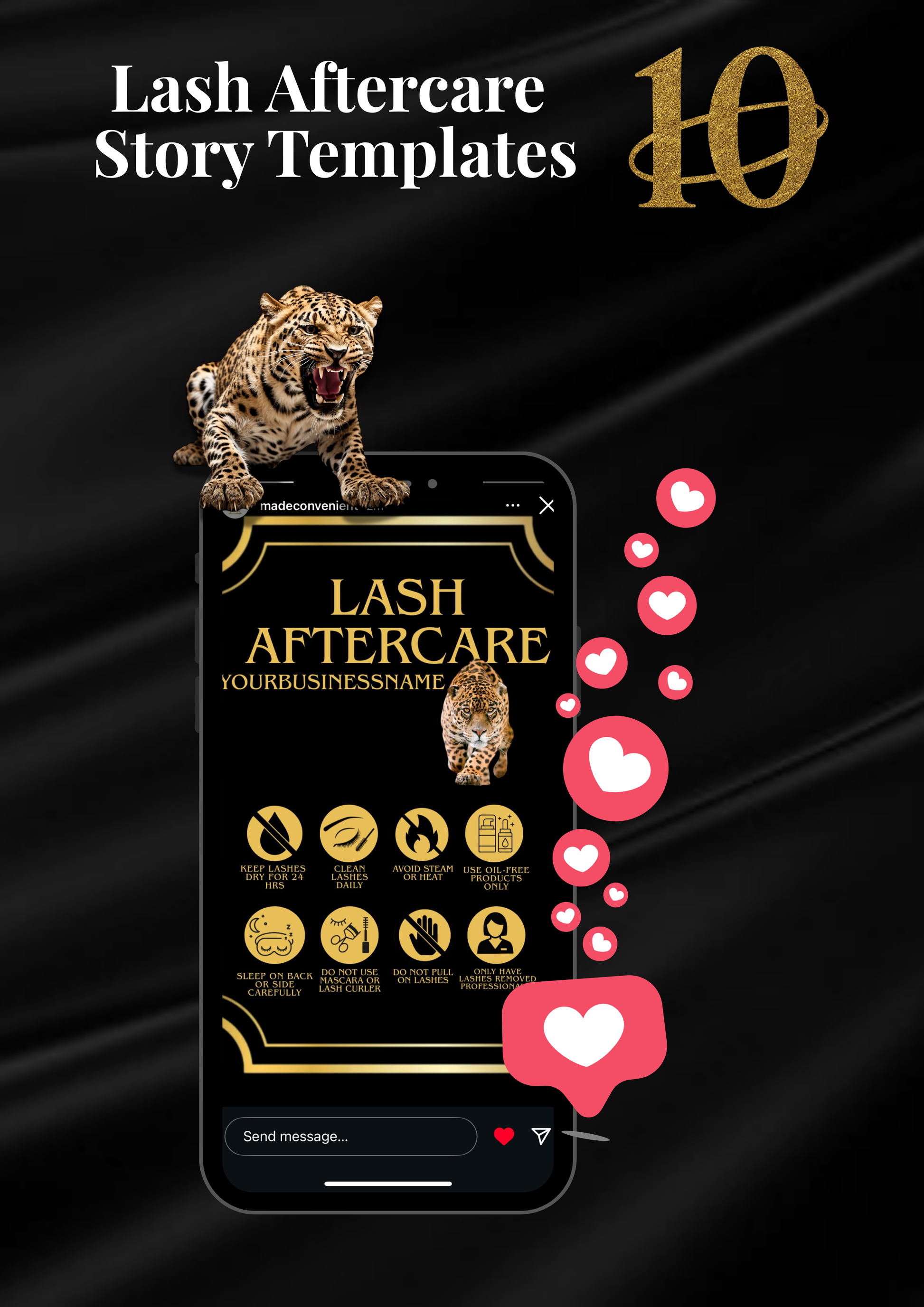 Elevate your lash business with this exclusive bundle of 10 Lash Aftercare Templates, crafted to impress clients and reinforce your brand’s professionalism. This set includes both card templates and Instagram story templates, giving you everything you need to stand out online and offline.